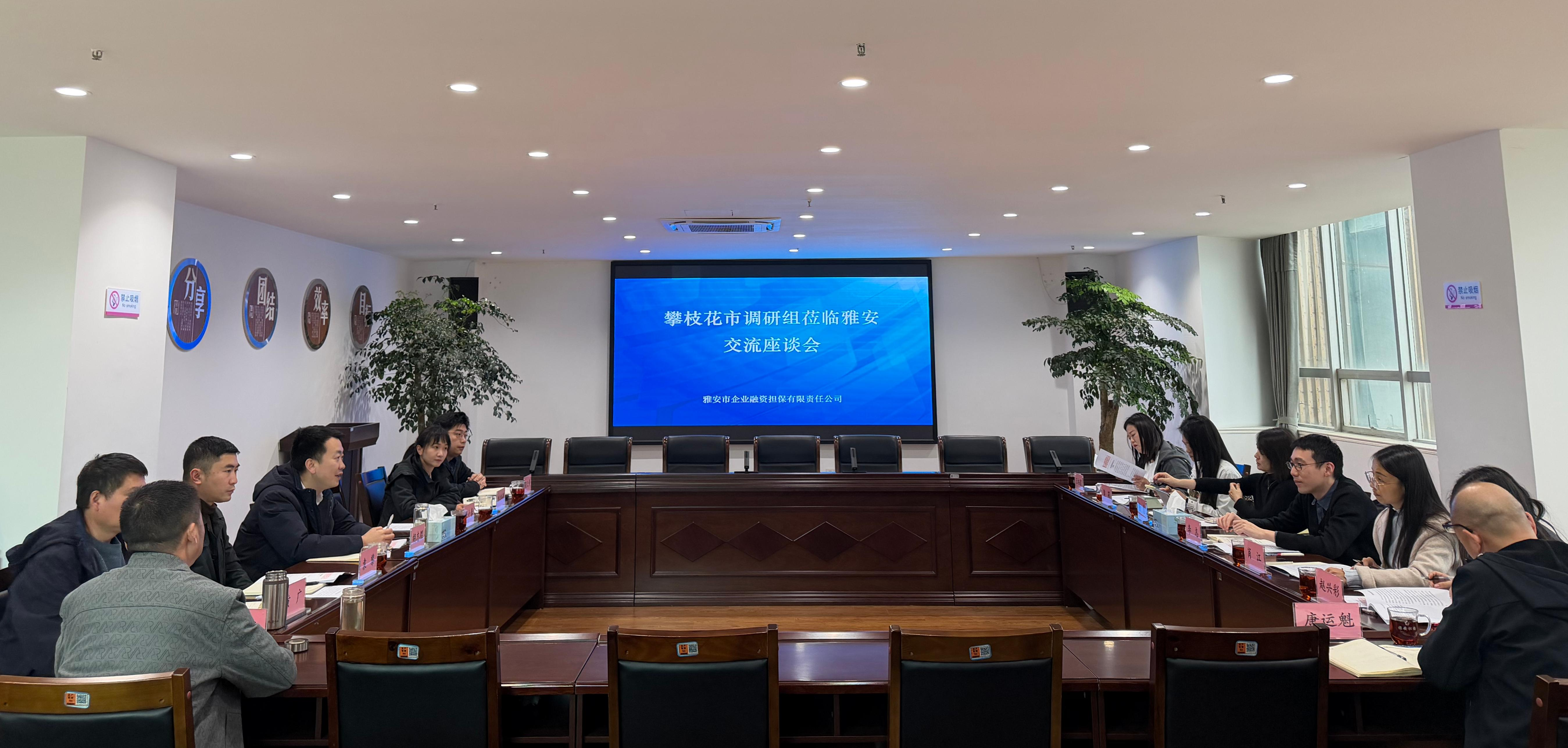 3月16日,攀枝花市財(cái)政局副局長(zhǎng)李志帶隊(duì),攀枝花發(fā)展(控股)集團(tuán)、攀枝花市創(chuàng)業(yè)貸款融擔(dān)公司一行來到雅安,就政府性融資擔(dān)保公司內(nèi)部治理與制度建設(shè)、業(yè)務(wù)開展、體系建設(shè)及風(fēng)險(xiǎn)控制等方面開展調(diào)研。雅安市財(cái)政局金融資本科科長(zhǎng)劉冉婷參加座談會(huì)。